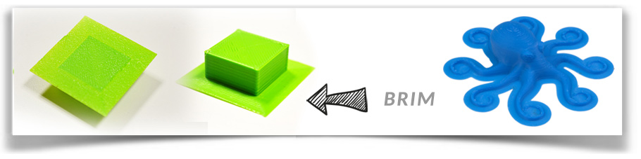 Le Brim (bord), est une fine couche que l’on imprime autour de l’objet. Elle consiste à élargir la première couche d’impression pour absorber les déformations et accrocher la pièce. Le brim est beaucoup plus facile à retirer que le raft mais se révèle moins efficace sur les pièces à faible surface de contact.