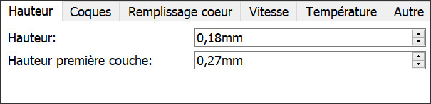 Hauteur : épaisseur des couches du modèle à imprimer. Le choix d'une valeur faible fera que la surface du modèle soit plus lisse.