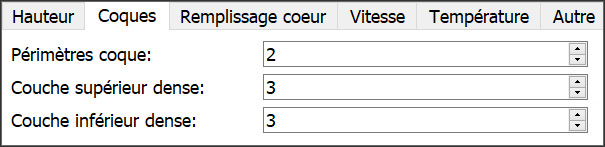 Périmètres coque : épaisseur de la structure externe de votre pièce. On place généralement 2 à 3 coques extérieures avant de commencer le remplissage intérieur