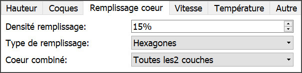 Densité : de 10 et 30% pour des pièces classiques (pas d'efforts importants). Jusque 75% pour les pièces nécessitant une haute résistance.