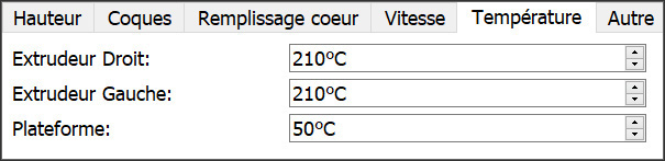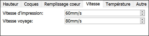 Vitesse d'impression : c'est la vitesse de déplacement de l'extrudeuse. D'une façon générale, plus la vitesse est faible, meilleure est l'impression. Pour l'impression au PLA, la vitesse recommandée est 60mm/s.