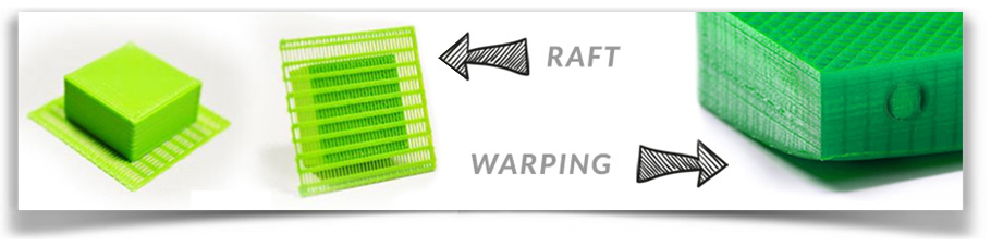 Le raft et une structure d’accroche que l’on imprime sur le plateau pour maintenir la pièce. Le Raft qui signifie «radeau» en anglais, se présente sous la forme d’une structure imprimée sous la pièce. Elle offre une meilleure surface d’accroch, améliore l’adhérence au plateau et diminue les risques de Warping (bord de la pièce qui se décolle = déformation).
