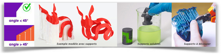 Lors de l'impression 3D chaque couche se dépose sur la précédente. Mais que ce passe-t-il quand il n’existe pas de « couche précédente »? Imaginons que vous imprimiez en 3D un arbre. Le tronc s’imprime sans difficulté, mais comment imprimer la première branche, horizontale et perpendiculaire au tronc ? Le plastique fondu qui est extrudé ne tiendra pas tout seul dans les airs ! Il faut qu’il repose sur quelque chose. C’est le rôle des supports.